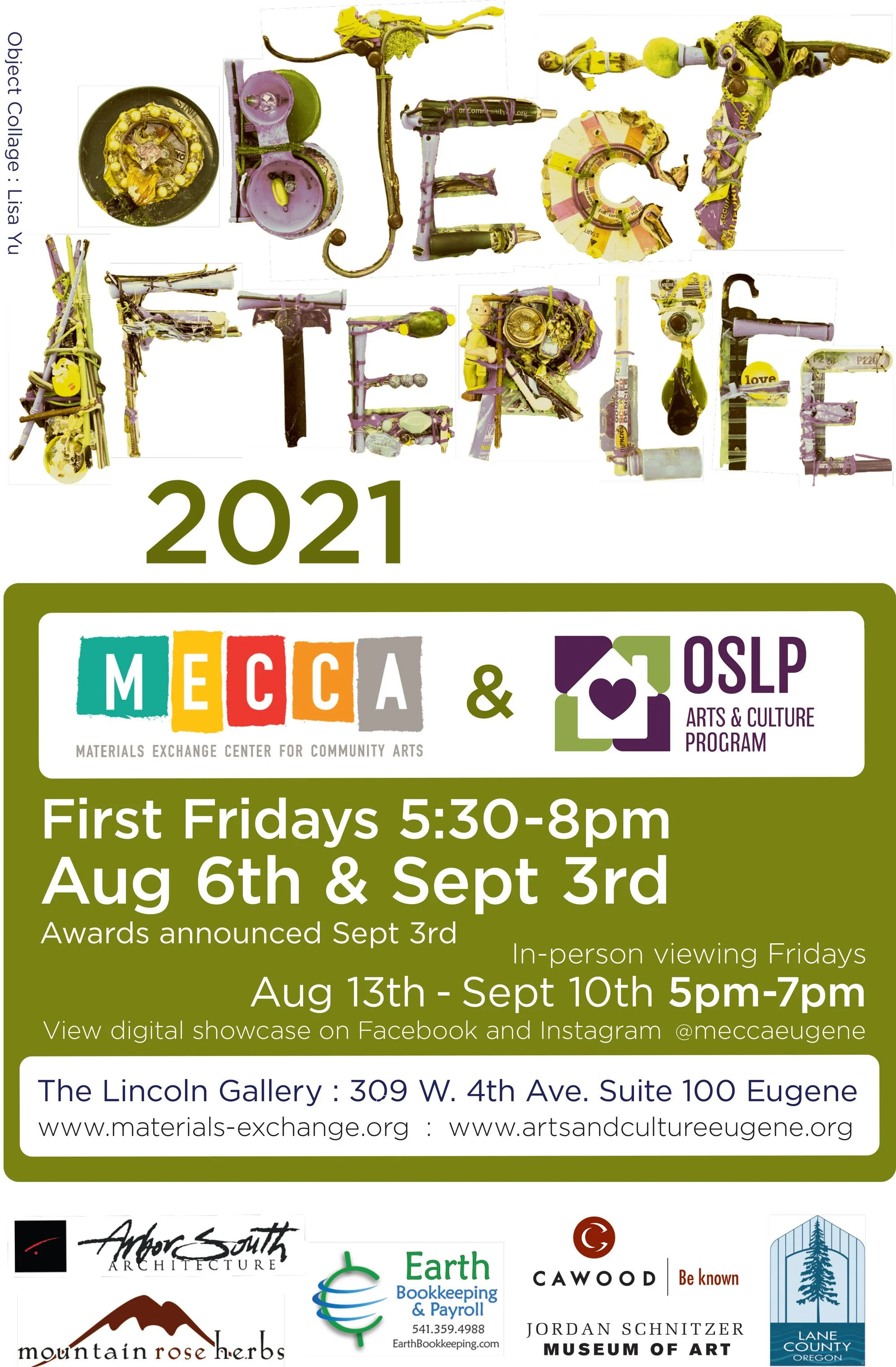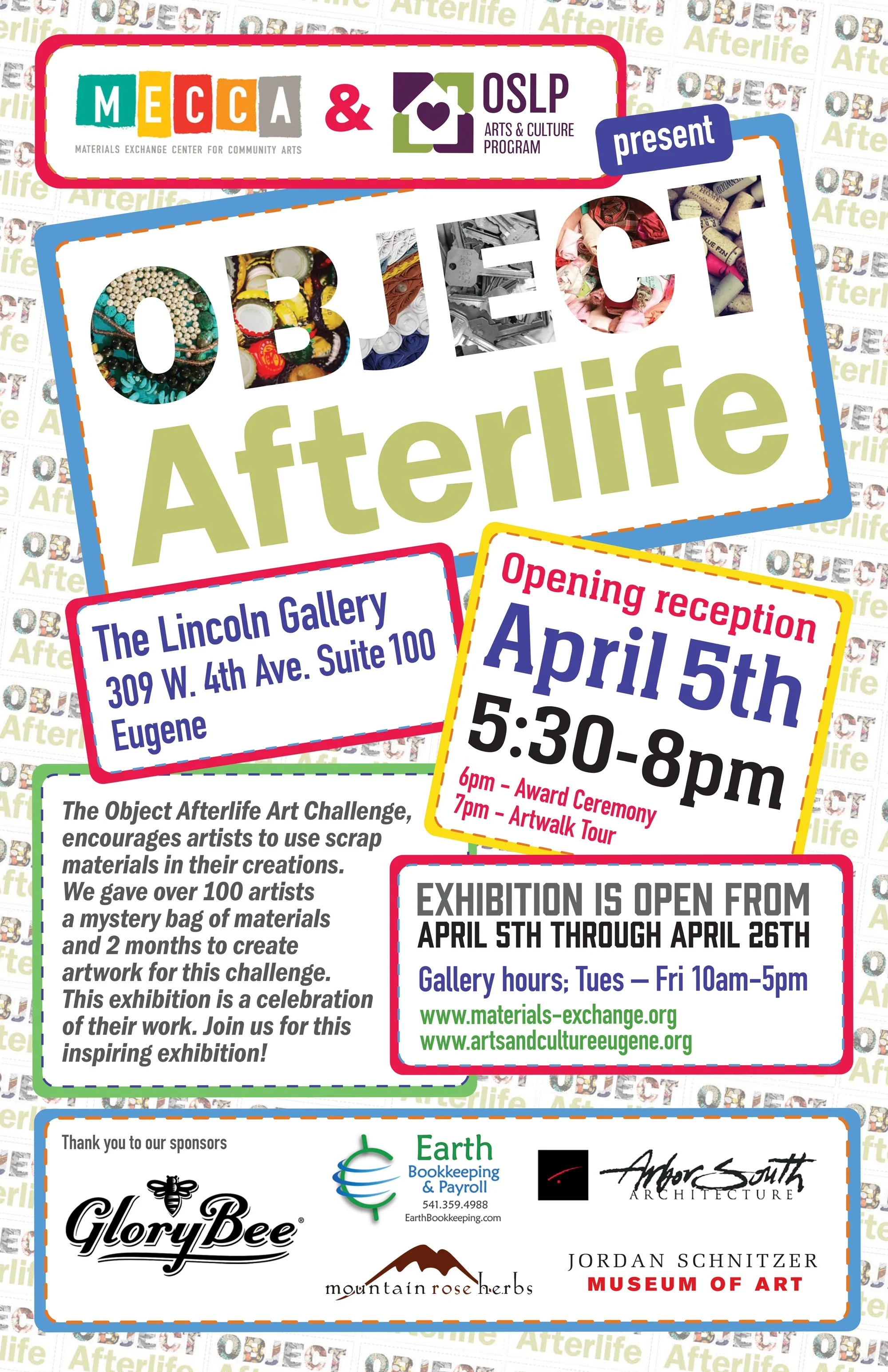 Poster for the Object Afterlife art exhibition, beginning with the logos of MECCA and Arts & Culture Program at the top. It announces the opening reception on April 5th from 5:30 to 8 pm at The Lincoln Gallery, 309 W. 4th Ave, Suite 100, Eugene. The View fullsize