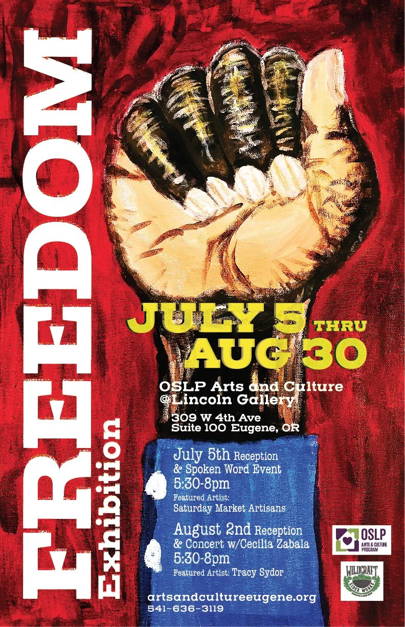 Poster for an event titled 'Reimagine Exhibition' with dates July 5 through August 30. The poster features a painted image of a clenched fist with dark nails on a red background. The event includes receptions and spoken word events on July 5 and Augu